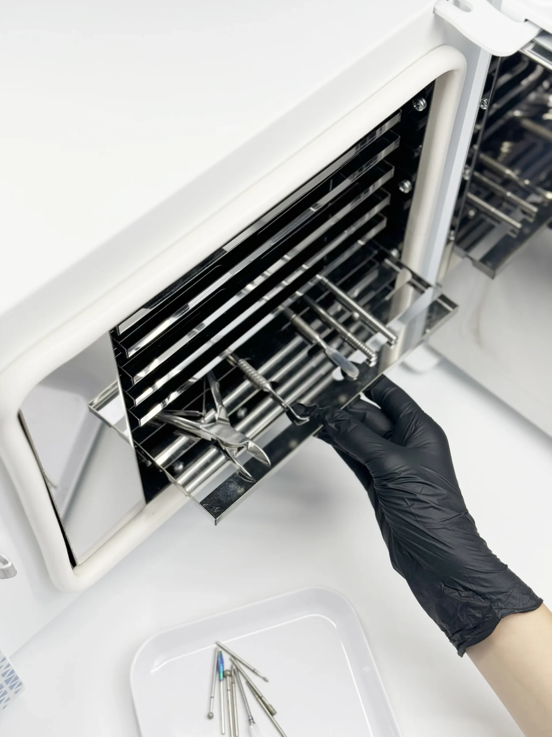 Modelo clásico. Los instrumentos se colocan en tres estantes horizontales dentro de la cámara. Esto permite la esterilización de 15 kits en una sola carga.